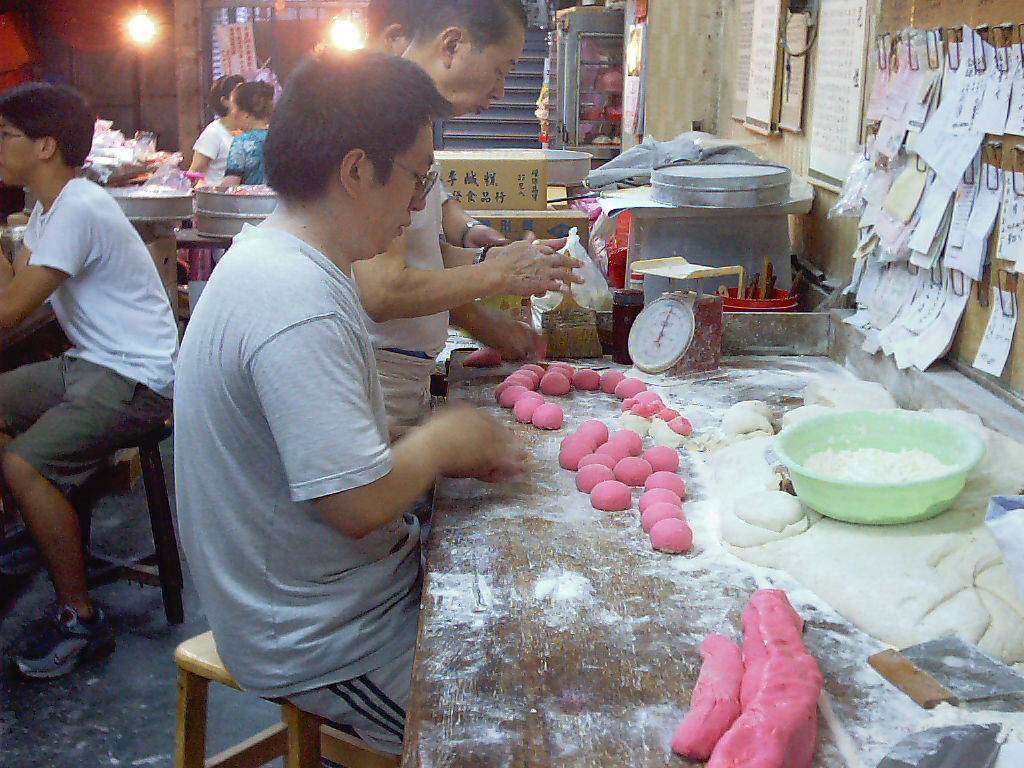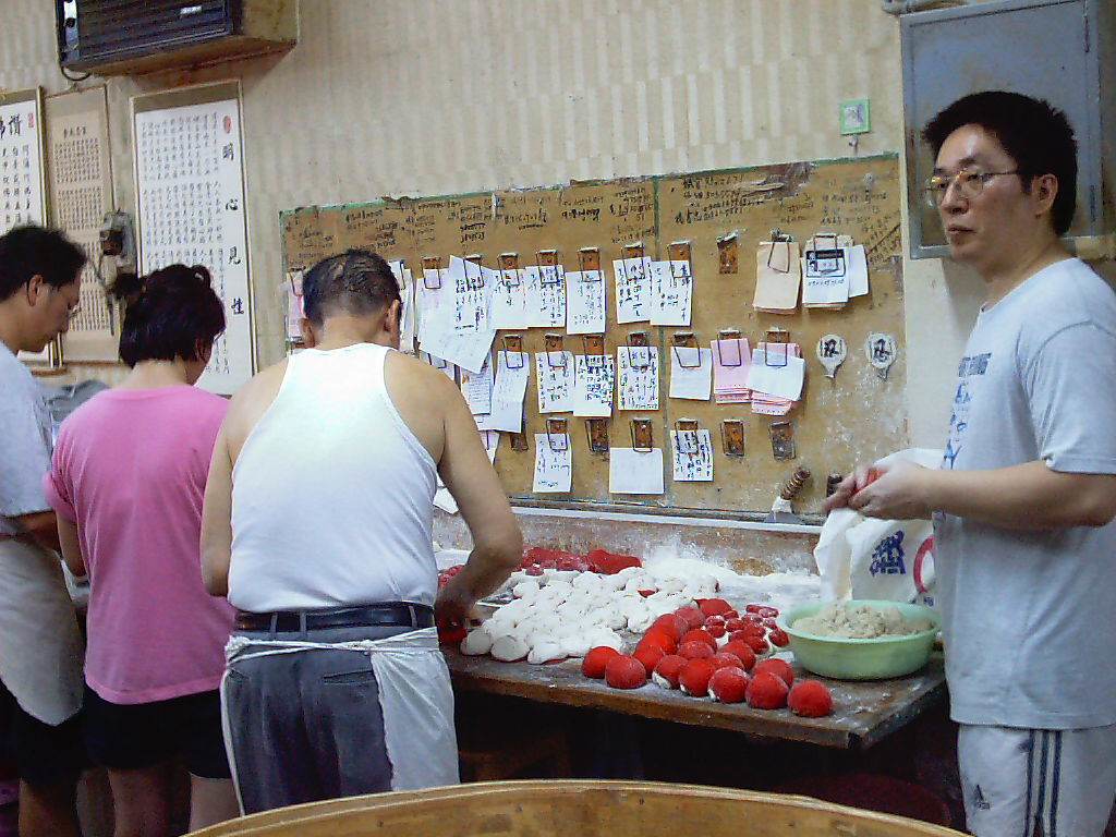 長年的合作,也培養出家族之間默契十足的分工協調,延續了上一代製作傳統糕餅的精神,其中,壽桃、紅龜粿、豆沙餅便是在傳統基礎上,改良自上一代傳承下來的口味。談到自家的熱門商品「壽桃」,池老闆娘表示,他們的壽桃在最初的揉製與攪拌步驟使用機器,其餘程序如包餡、搓型、發酵、蒸煮、上色,全都堅持以手工完成。一車約 250 顆壽桃,從備料到出爐,需要花上二至三小時的全程投入。她指向後方的工廠補充道,自家做的壽桃綿密,又帶有老麵的香醇口感,每一口都能夠品嘗到手工製作的溫度與味道。而在製作和造型上,為維持壽桃在祭祀上的視覺形象與象徵意義,同時顧及顧客對食用色素的疑慮,因此並未對壽桃進行過多的裝飾加工。老闆自信地表示:「皮到內餡,除了底下的墊紙都可吃!」並依循傳統供佛的老味道,保留與第一代相同的製程。製作的現場就在店舖的後方,除了延續上一代即在店裡幫忙的老師傅技藝,也有下一代年輕人接手成為後場主力;前場則由第二代經營銷售與簡易包裝加工。如此輪替分工,成為家中成員彼此支援的默契。