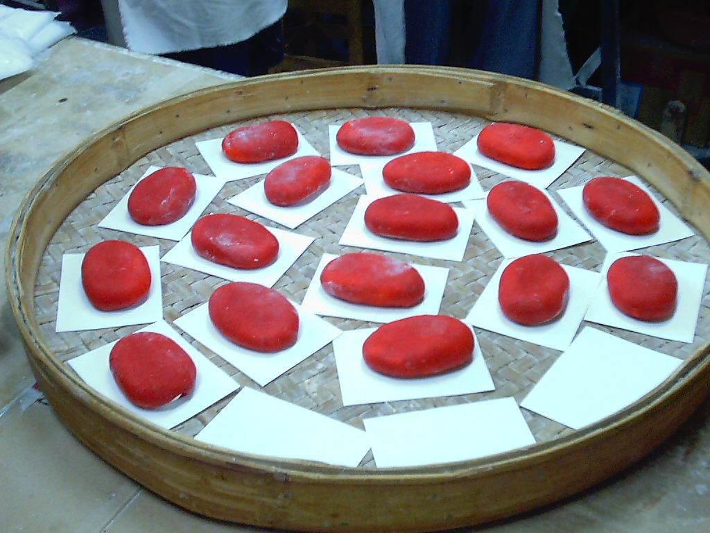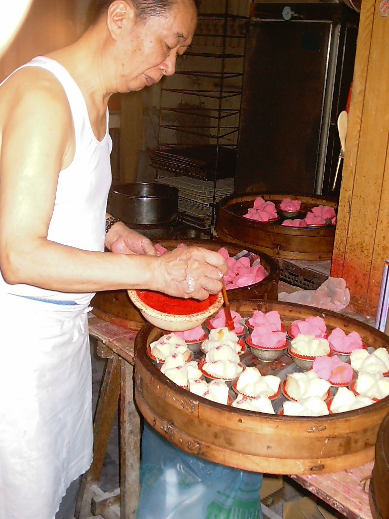 右圖/楊爸爸幫發糕上色,和現代噴漆不同,過去是用筆刷點印上色